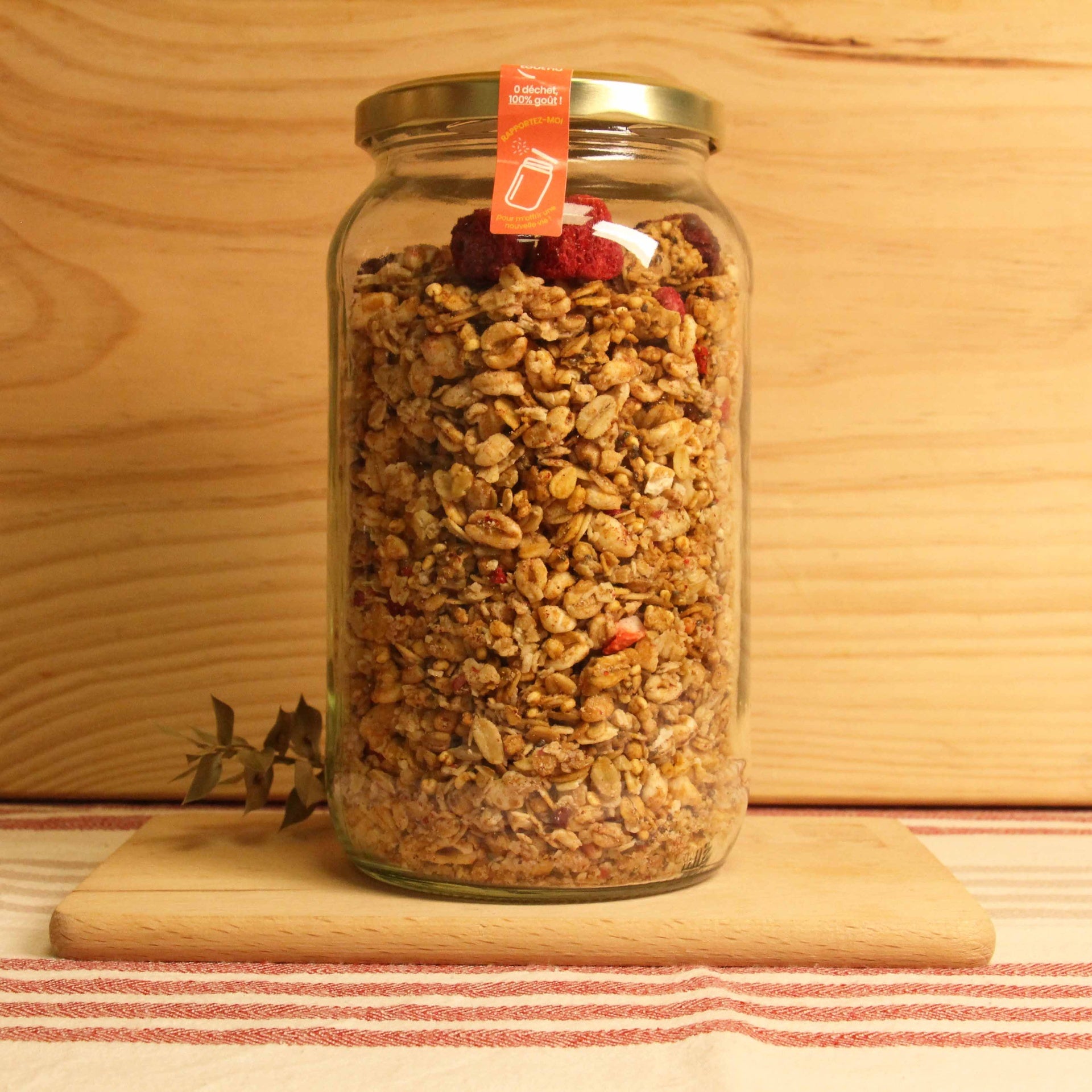 Flocons d'avoine* 49,1%, sucre de canne*, huile de tournesol riche en acide oléique*, flocons de blé* 6,1%, blé dur soufflé* 5,4%, noix de coco déshydratée*, graines de chia* 2,8%, quinoa extrudé * 2,4% (farine de quinoa 43%*, farine de riz*, farine de maïs*, sucre de canne*, sel), graines de tournesol*, fruits forestiers déshydratés* 2% (framboises*, mûres*, fraises*, myrtilles*, en proportion variable), millet soufflé* 1,6%, sucre roux*, sel.