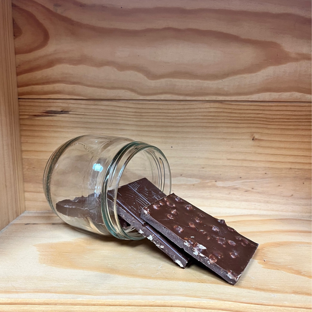 sucre de canne*, beurre de cacao*, lait entier*, cacao* (37%), riz soufflé* (10%), riz blanc* (43%), sucre de canne* (5%), poudre de cacao* (2%), lait écrémé*, émulsifiant (lécithine de tournesol*), fleur de sel, vanille de Bourbon*.