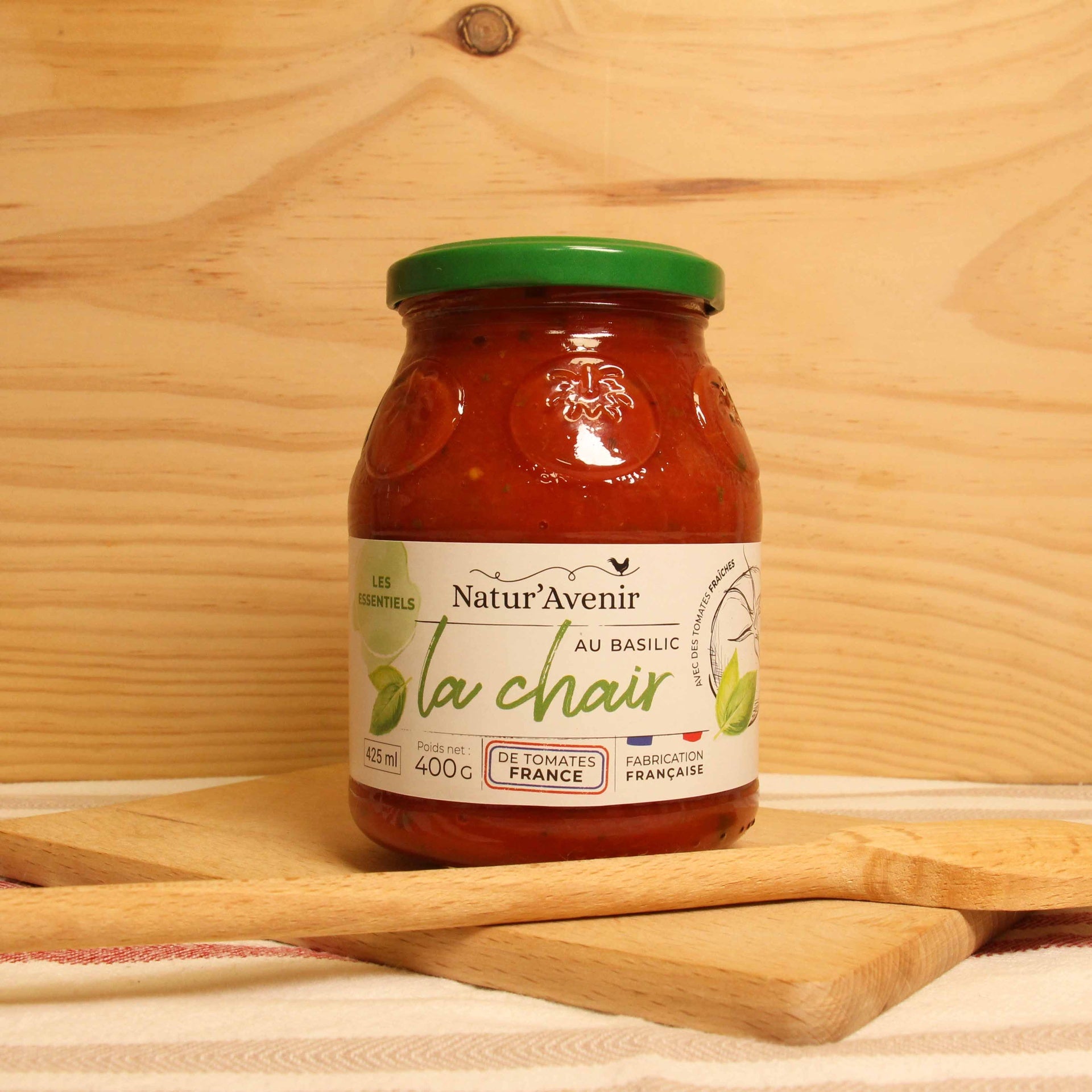 Chair de tomates* origine France (92.2%), Oignons* (4%), Huile de tournesol* (2%), Basilic surgelé* (1.5%), Sel (0.3%)