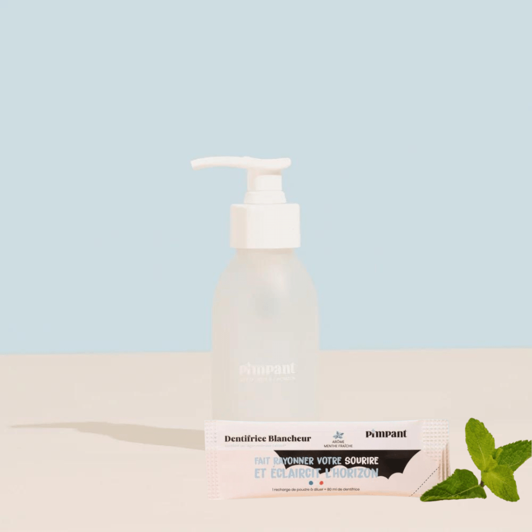 Ce kit contient : une bouteille et une recharge en poudre de 8g à diluer avec l’eau du robinet permet de créer 80ml de Dentifrice Blancheur (comme un dentifrice en tube classique).