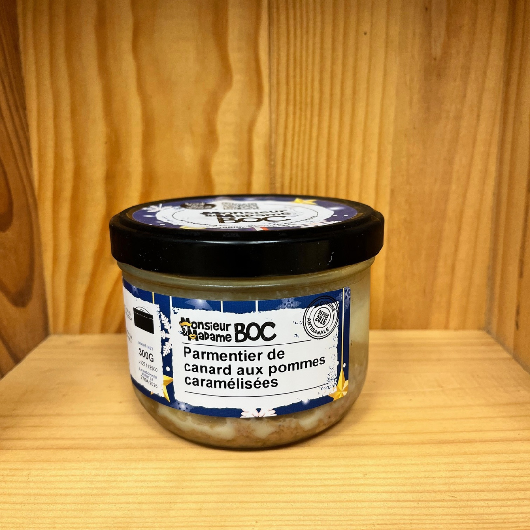 Pommes de terre 53%, effiloché de canard (FR) 30%, pommes, oignons, lait, beurre, huile de tournesol et d'huile d'olive vierge extra, sucre, sel, poivre