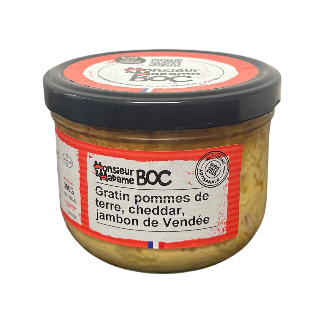 Pomme de terre 53%, crème entière 13,7% (crème, stabilisant : carraghénanes), oignons 10%, pétales de jambon sec (UE) 9%, cheddar 8% (Lait, sel, ferments lactiques, E160b, présure, fécule de pomme de terre), eau, huile de tournesol et huile d'olive vierge extra, sel, poivre noir