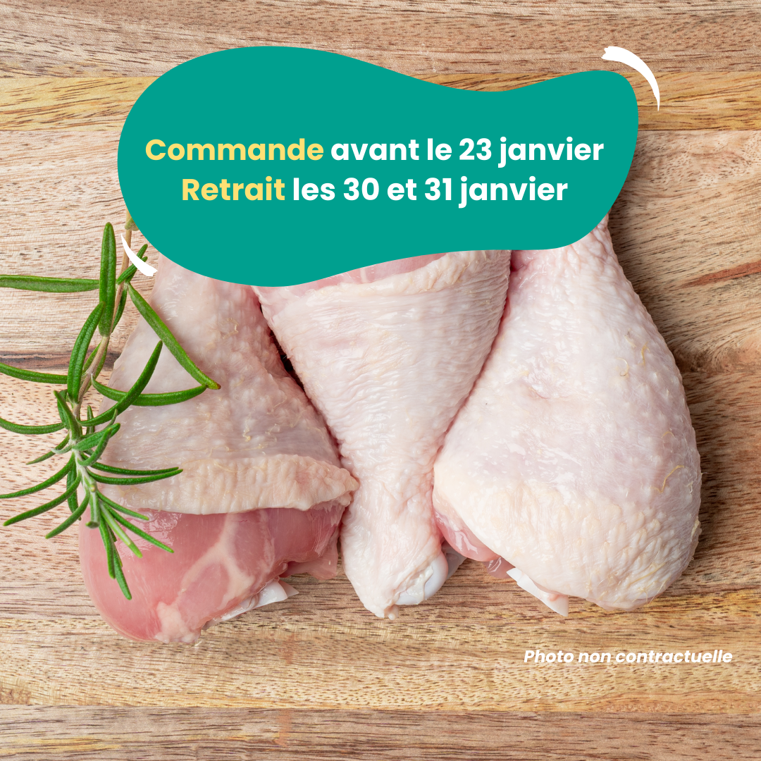 Pour réserver vos cuisses de poulet, un acompte de 15€ vous sera demandé. Ce produit étant facturé au poids, nous ajusterons le prix final de l'article en conséquence au moment du retrait. (Uniquement par CB)