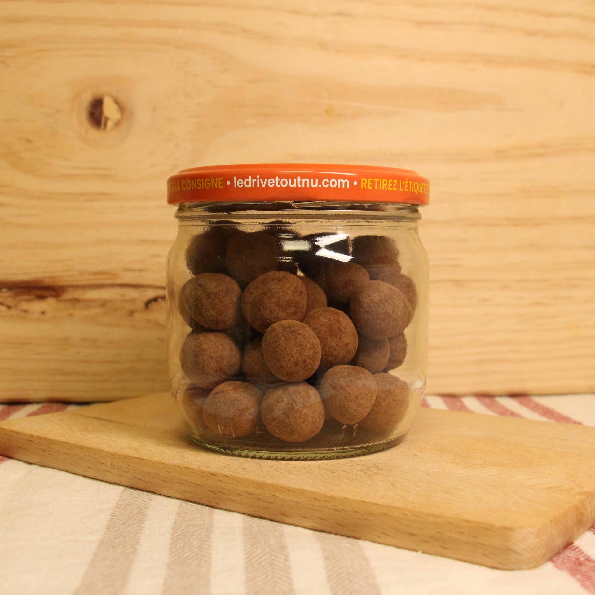 Délicieuses noisettes grillées enrobées de chocolat noir.