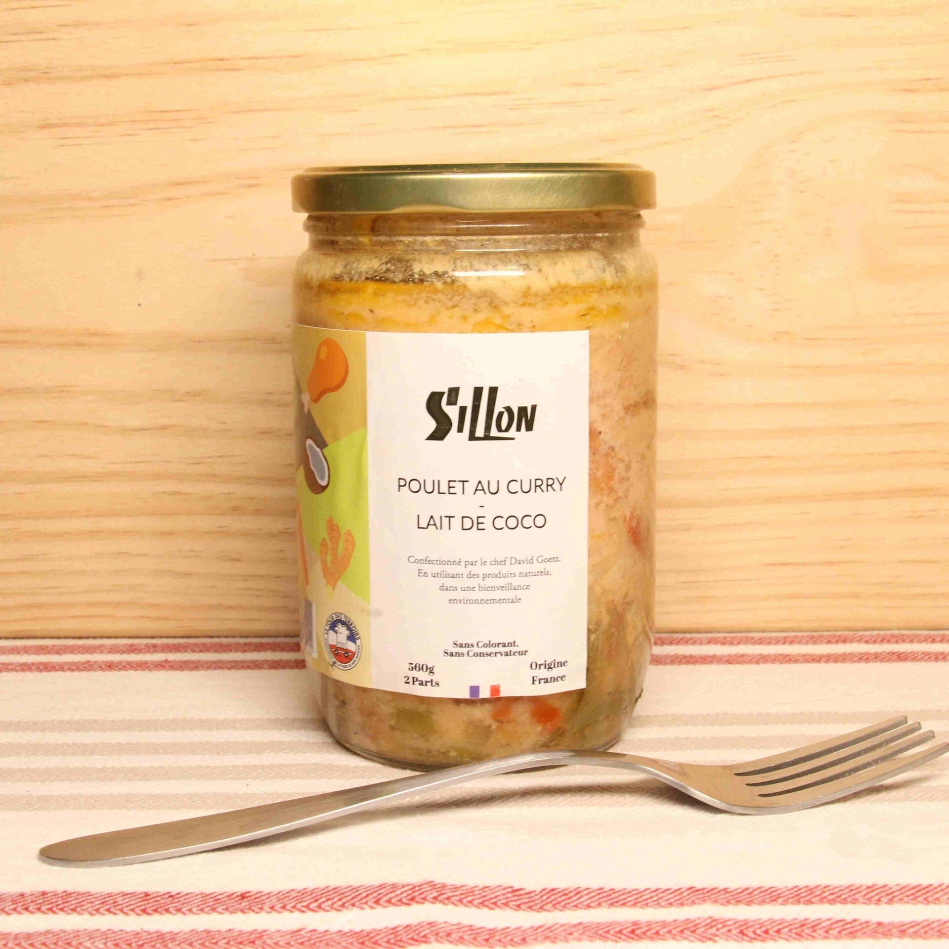 Poulet 74%*, lait de coco 13%, bouillon (eau, oignons, carottes, poireaux, céleri, carcasse de canard*, os de veau*, ail, clou de girofle et baies de genièvre), oignons, poivrons, courgette, farine, tomate concentré, sel, curry vert, ail, poivre, gingembre.